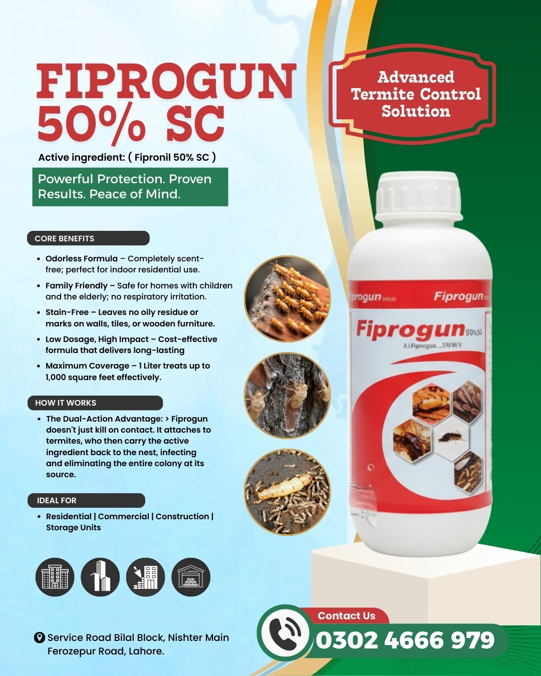 Get the best Fiprogun 50% SC price in Lahore, Pakistan, and that is the best and most powerful termite control chemical in Pakistan, designed to eliminate termites (deemak) permanently from homes, offices, buildings, and commercial spaces. If you’re searching for a termite spray, Deemak spray, or a long-lasting termite control spray in Pakistan, Fiprogun 50% SC is the most trusted professional-grade solution recommended by King Pest Control Lahore.